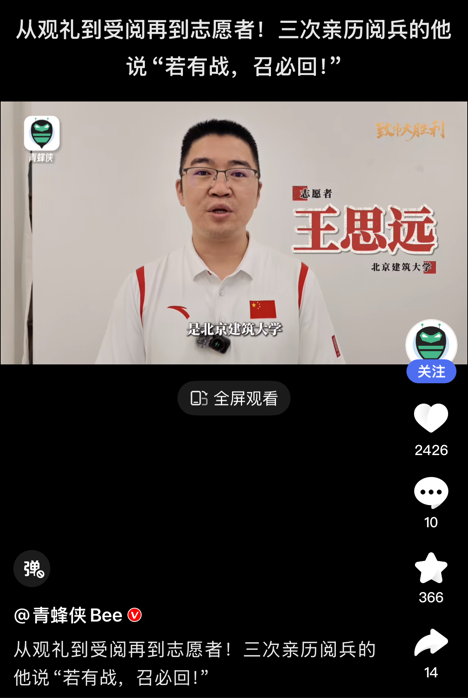 2025年9月3日,北京建筑大学建筑与城市规划学院辅导员王思远接受记者采访,讲述了他从观礼到受阅再到志愿者三次亲历阅兵的故事。