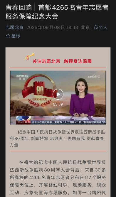 在盛大的纪念中国人民抗日战争暨世界反法西斯战争胜利80周年大会背后,来自30多所高校的4265名青年志愿者分布在117个服务保障岗位上,开展路线引导、现场服务、观众互动、应急处置等志愿服务,如同一台精密仪器的一个个齿轮、螺丝钉,保障大会平稳有序进行。