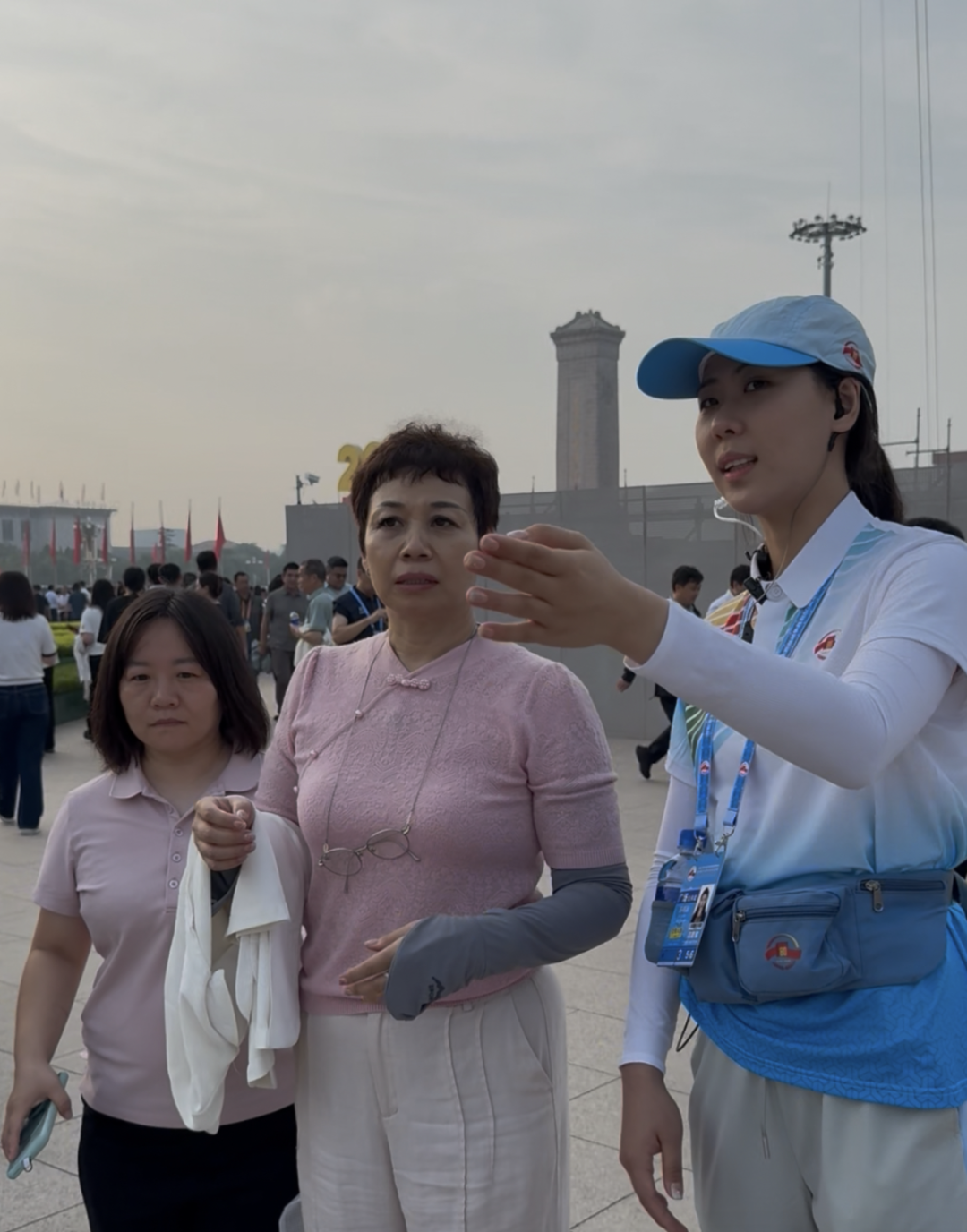 高校志愿者在天安门广场为观礼嘉宾提供服务