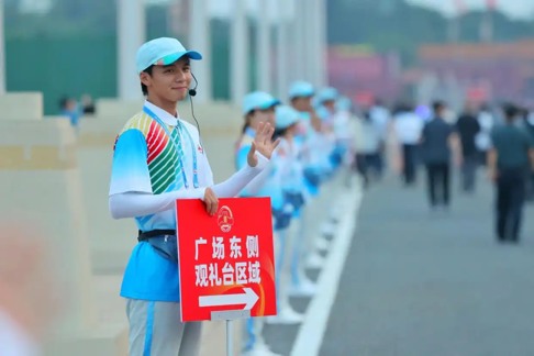 北京工商大学研二学生廖承禹是学校团委的学生副书记,曾参加过多项首都重大活动。目前,他已经累计志愿服务时长1094小时,是一名“志愿达人”。在这次活动中,他在广场东侧路线担任流动引导岗。“我和其他志愿者化身最美的风景线,排布在观礼人员必经的路线途中,用温暖的微笑引导、护送观礼人员有序经过。”廖承禹说,“人们的笑容,是对我最好的表扬。”