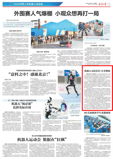 本报讯(记者 刘苏雅)昨天,北京四中道元校区初三年级学生于程程作为北京建筑大学“驰稳”联合队的一员,走上2025世界人形机器人运动会赛场。年仅14岁的她,是本届人形机器人“奥运会”上参赛年龄最小的参赛队员,在“驰稳”队参加的“灵机一动”项目中,她参与了机器人的动作设计。