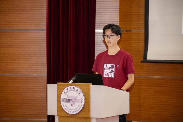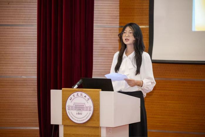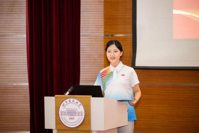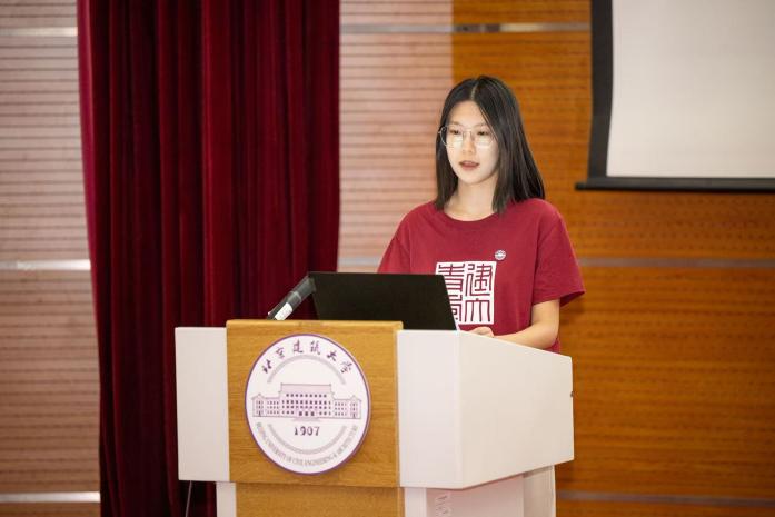 在校新生代表、动力252李溪晗讲述了自己高中时通过参与北京市科学建议活动便埋下了建设人民城市的种子。来到北京建筑大学,面对即将开始的大学生活,她表示要践行“实事求是、精益求精”的学习精神,以薪火相传的态度与国家发展同频共振,以描绘城市蓝图为光荣使命舞动时代的脉搏。