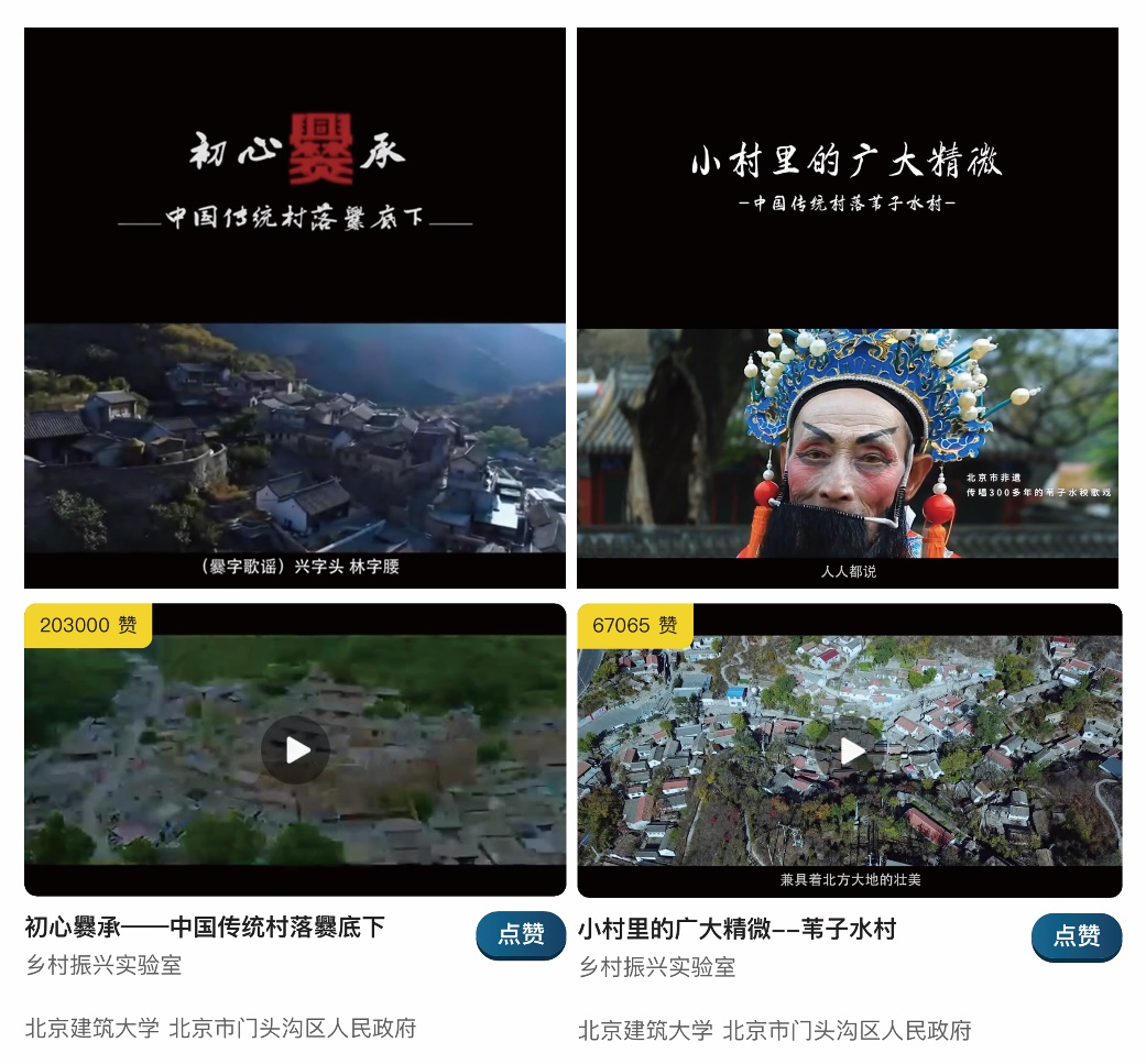 团队在门头沟区传统村落中发动村民和村民集体遴选实施22项带动性强、共识度高的建设项目,通过精细化设计和多方参与,实现风貌保护、村庄增收和人居环境改善的综合目标。采集逾2000gb数字化资料,探索引入人工智能方法进行农房风貌科学管控引导,为每个传统村落建立数字化档案和文化遗产数字资源平台,实现门头沟区传统村落三维实景场景、数字影像展示、文化遗产数字化档案管理的综合功能。团队策划拍摄爨底下村、苇子水村的宣传片,在中宣部、中央网信办等部门举办的“谁不说俺家乡好”活动中,位于全国前列,获得新华社客户端300余万阅读,30余万点赞。