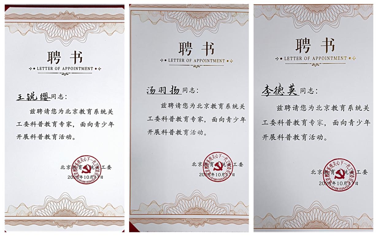 10月17日,北京教育系统关工委2025年新增青少年科普教育基地集体授牌及科普教育专家聘任仪式在北京化工大学举行。我校退休教师汤羽扬、李德英、王锐缨3人被聘为科普教育专家。校关工委委员于志洋参加聘任仪式,并代表学校领取专家聘书。