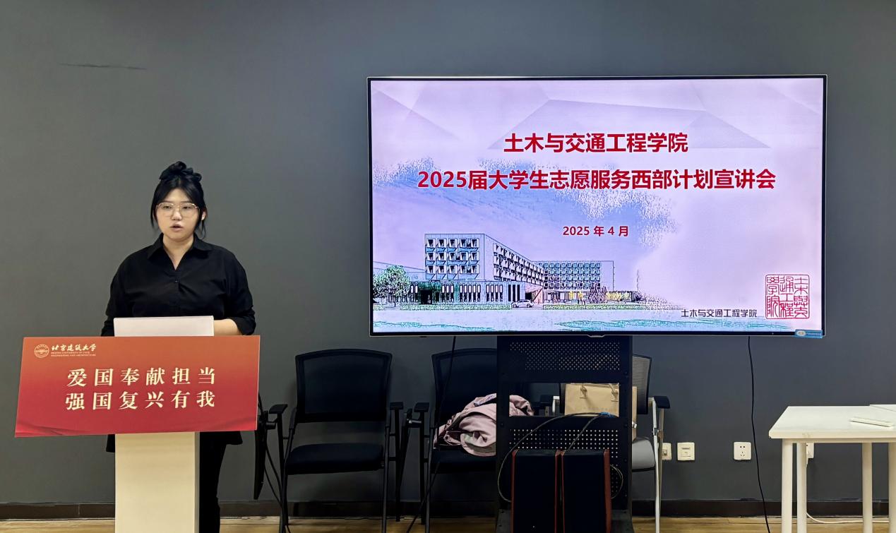 为深入贯彻落实党的二十大关于“全面推进乡村振兴”实施区域协调发展战略”的重要部署,引导青年学子将个人成长融入国家发展大局,4月9日,由土木学院开展的大学生志愿服务西部计划宣讲会在基b404举行。本次活动通过政策解读、榜样示范、互动交流等形式,激励土木学院本科生响应党和国家号召,到西部去、到基层去、到祖国最需要的地方去,在全面建设社会主义现代化国家的火热实践中绽放青春光彩。