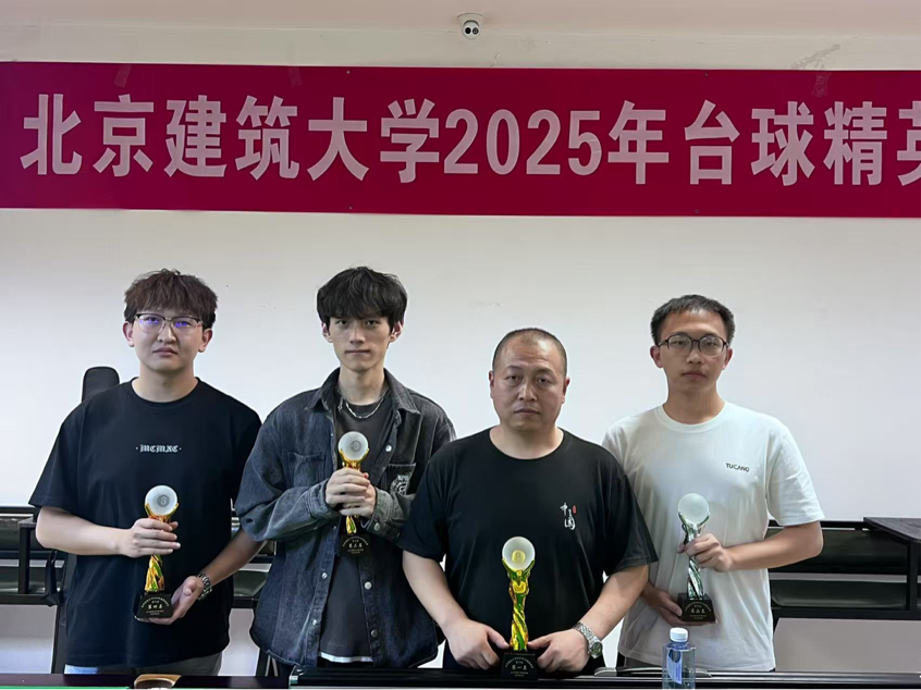 2025年4月15日,为丰富校园文化生活,提升学生体育竞技水平,由我校体育部举办的2025年北京建筑大学台球精英赛在校体育馆顺利举行。本次比赛吸引了各学院学生和教职工约60名台球爱好者参与,经过一天的激烈角逐,男生组教职工冯亚军以及女生组人文学院刘翊天凭借精湛技艺夺得冠军奖杯。