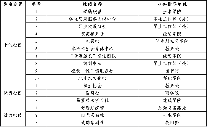 近日,我校2024-2025学年“十佳”学生社团评选顺利结束,党委组织部、党委宣传部、学生工作部(处)、保卫部(处)、研究生院、教务处、党委教师工作部、后勤与基建处和校团委等学生社团建设管理评议委员会成员单位进行评选,最终学霸联盟,职业发展协会等10个社团获评“十佳”学生社团,招生协会等3个社团获评优秀学生社团、青春红丝带等3个社团获评活力学生社团。