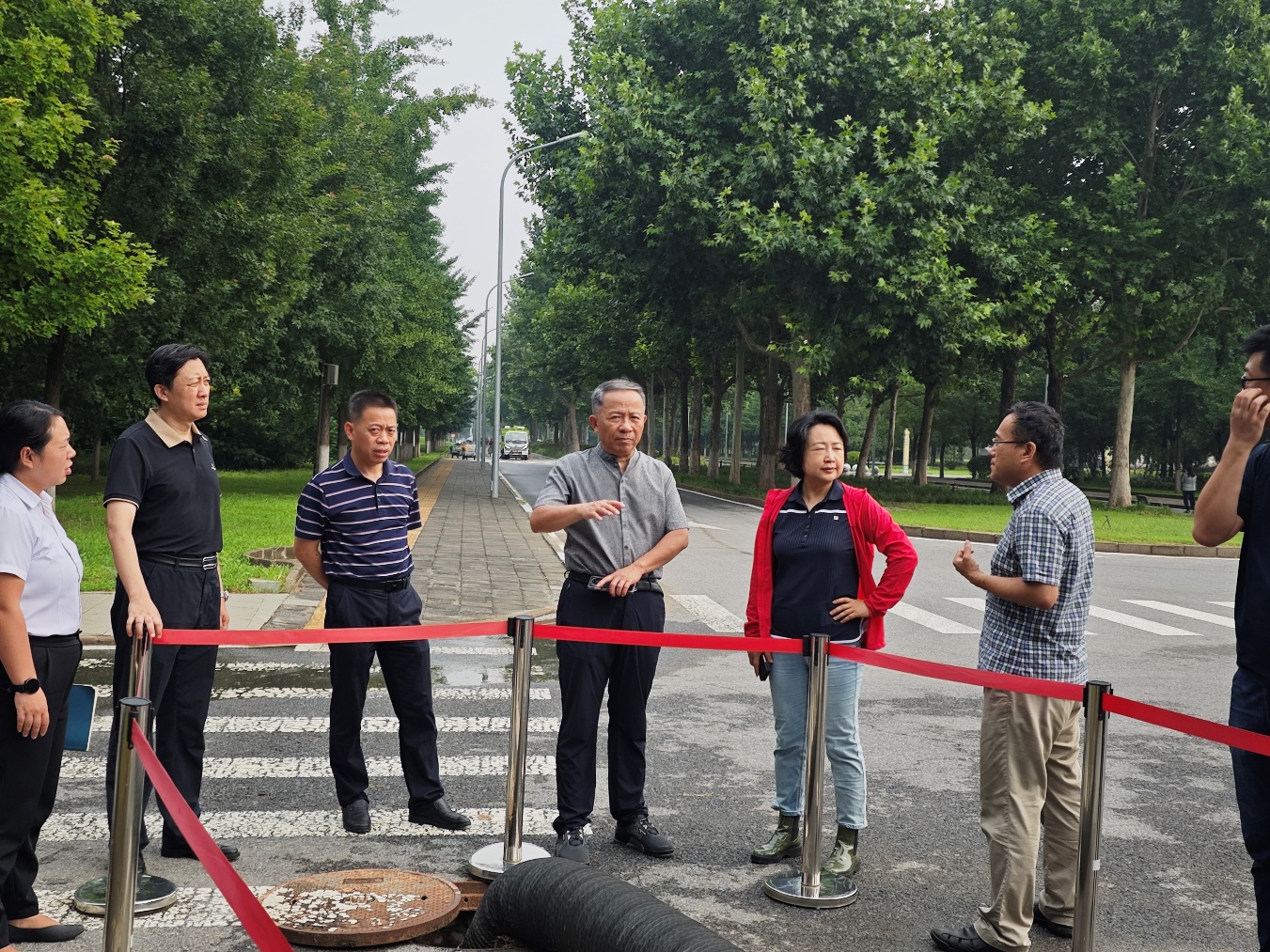 在学校南门雨水总排口,巡查周边道路雨水箅子的清淤状况,张大玉校长询问了解防汛物资的储备、大型柴油防汛泵车的排水能力及设备性能等情况。