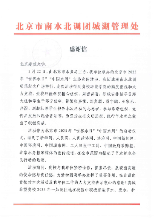 北京市南水北调团城湖管理处对北京建筑大学在本次活动中的大力支持表示衷心的感谢,向组织参与活动的师生志愿者发来感谢信,希望双方在未来继续加强合作,共同为水资源保护和可持续利用事业做出更大的贡献。